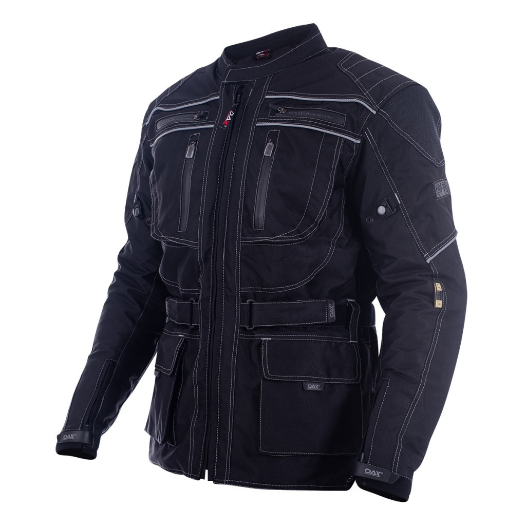 Breathable waterproof long textile jacket, removable shoulder, elbow and back protectors, removable lining with waterproof membrane, outer layer from high-quality MaxDura / Dublan polyamide fabrics, multiple storage pockets and wide back pocket, Air vent waterproof Zips, Velcro® closure side waist adjusters, sleeve width adjustment, zipper for pants connection